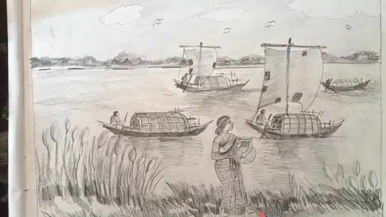 Image Of How To Draw Scenery Of Bank Of The River Village Woman Carrying Water
