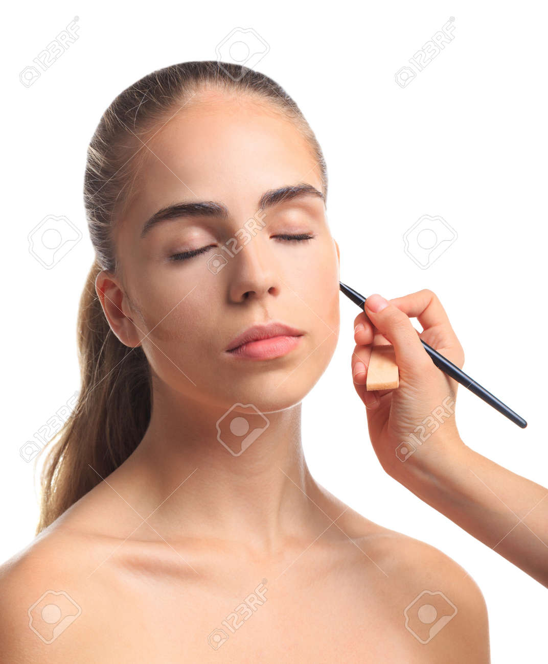 A Girl Draw A Contour Of Cheekbones On A White Isolated Background