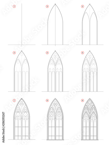 Image Of How Draw Stepwise Sketch Gothic Stained Stock Vector