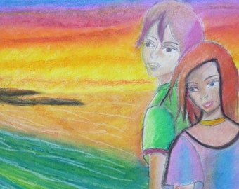 Image Of Crayon Painting Woman In The Sunset Etsy