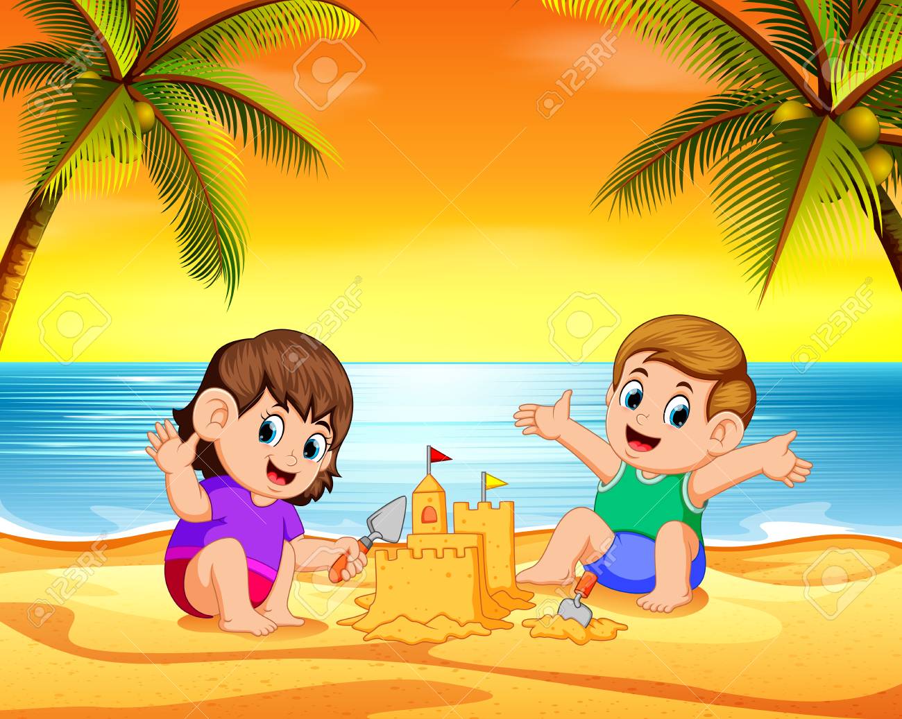 The Children Playing In The Beach And Make The Castle With The