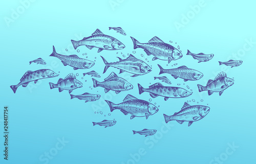 Image Of Fish School Fishes Group Hand Drawn Sketch Restaurant