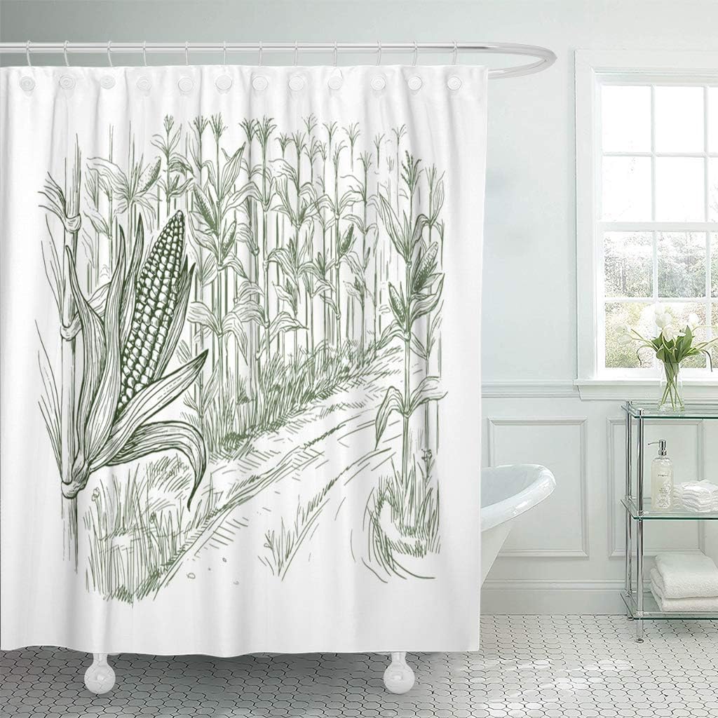 Pauseboll Green Corn Sketch Cornfield With Road Between Fields Maize Draw Farm Agrarian Shower Curtain Bathroom With Hooks Waterproof Polyester