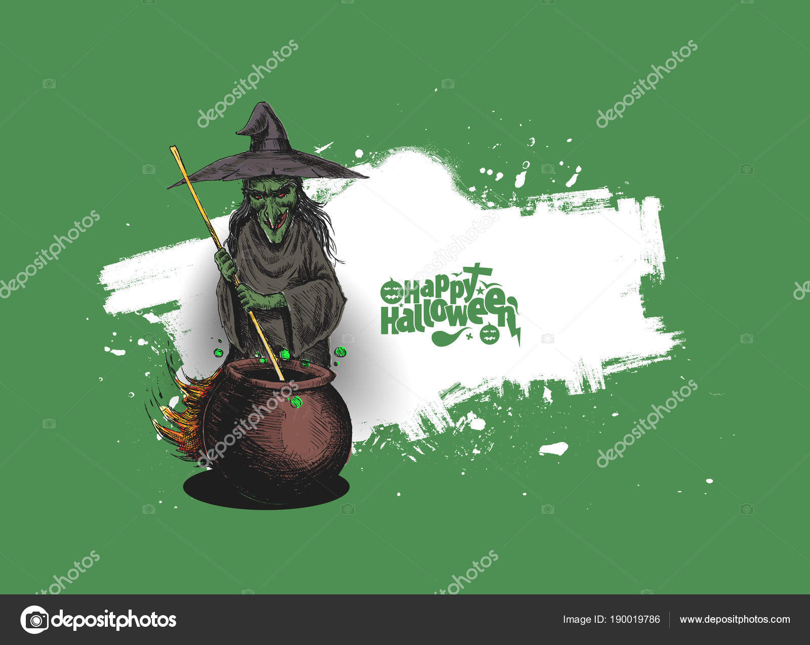 Image Of Witch Cooking Potion In Pot With Text Happy Halloween Hand