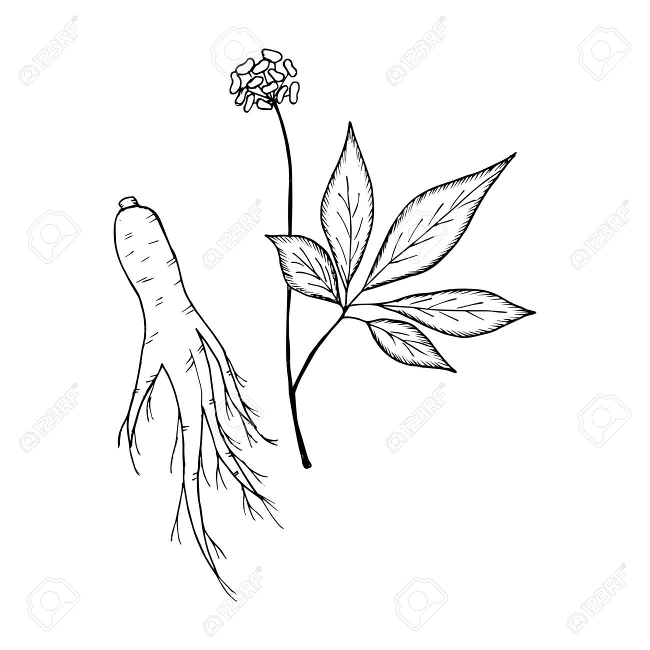 Image Of Root And Leaves Panax Ginseng Sketch Style Hand Draw