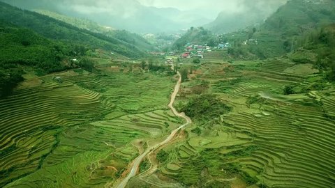 Image Of Beautiful Cascades Rice Fields Green Terraces Drawing Texture Water Reflection Old Authentic Village Home Among Mountains Clouds Canyon Country Road Exotic Asia China Vietnam Aerial Forward